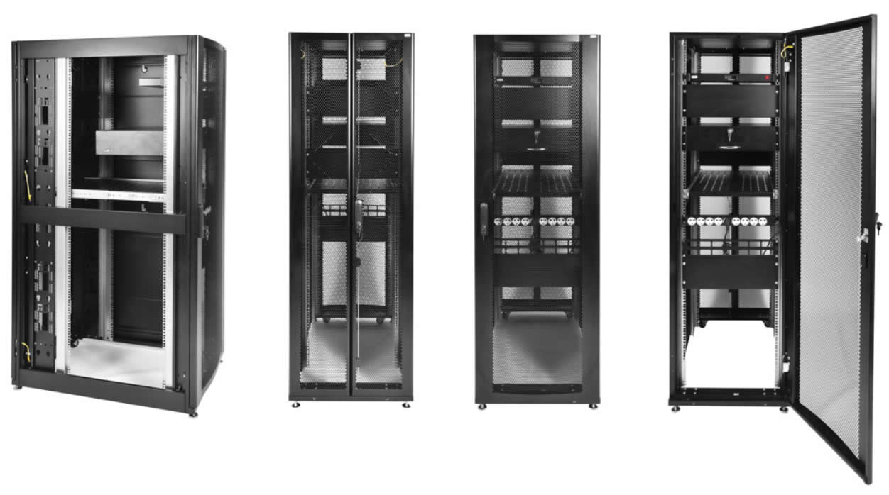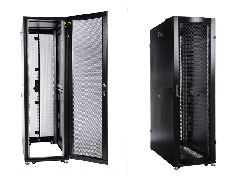 В зависимость от комплектации шкаф может поставляться с передней и задней перфорированными дверьми (одностворчатыми или двухстворчатыми) усиленными боковыми стенками. Двери фиксируются замками с ручкой. Возможно установка двери как с левой, так и справой стороны. Двери имеют возможность быстрого беинструментального снятия и установки.