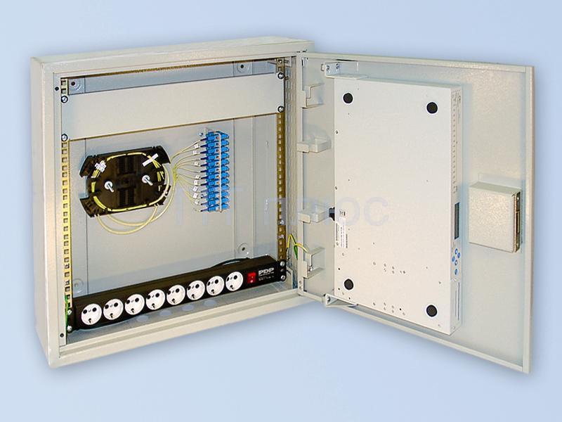 Возможность установки на стену и в стойку 19". Выдвижной монтажный блок. Верхняя открывающаяся крышка с замком. Поворотный модуль с оптическими розетками. Ввод кабеля - прямой и боковой.