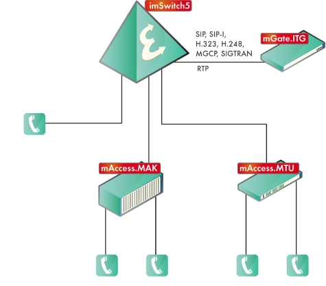 mGate.ITG – магистральный шлюз IP-телефонии. Обеспечивает взаимодействие “Протей-imSwitch5” с оборудованием телефонных сетей с коммутацией каналов (TDM) на уровне межстанционных трактов E1 (ОКС №7, EDSS-1, 2ВСК).