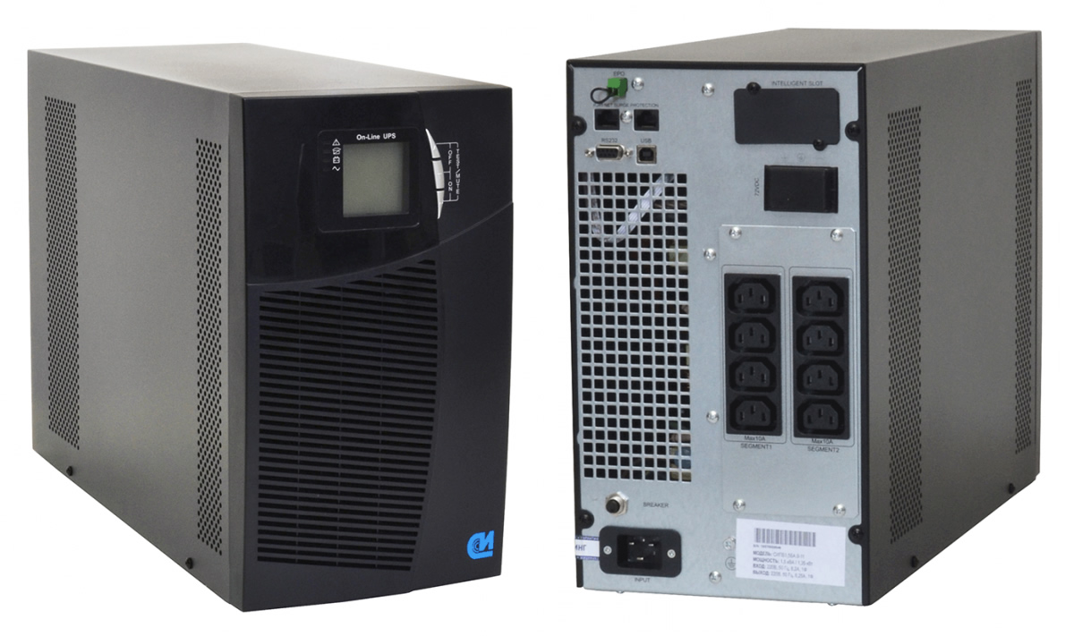 СИПБ1,5БА.9-11 (ДЕШК.435241.013) - онлайн источник бесперепойного питания двойного преобразования мощностью 1500ВА с выходным коэффициентом мощности 1,35, встроенными аккумуляторами (6 шт.), возможностью подключения внешних батарейных блоков и внутренним слотом для установки SNMP-карты. Онлайн ИБП СИПБ1,5БА.9-11 имеет информативный ЖК-дисплей, встроенные интерфейсы управления (USB и RS-232) и порт аварийного отключения (EPO). Опционально - интерфейс "сухие" контакты.