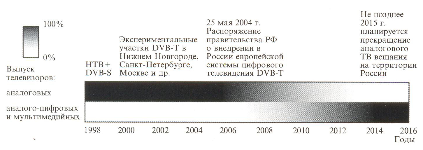 Согласно концепции внедрения цифрового телевизионного вещания в России не позднее 2015 г. намечается прекращение аналогового ТВ вещания на всей территории страны. Это означает, что формируется огромный рынок приемной цифровой телевизионной аппаратуры объемом в десятки миллионов цифровых телевизоров и цифровых приставок.