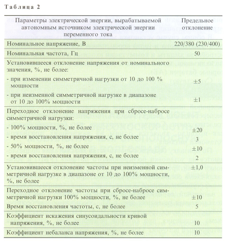 - Электрические требования. Электроснабжение оборудования осуществляется от промышленной сети переменного тока и автономных источников электрической энергии с параметрами, приведенными в табл. 1 и 2.