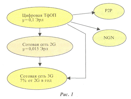 Какая-то часть речевого трафика цифровой ТфОП будет мигрировать из нее непосредственно в 3G. Сегодня для точной оценки этого процесса недостаточно статистических данных, хотя вполне корректным выглядит предположение, что у не превысит 0,015 Эрл. Заметим, что с точки зрения распределения средней интенсивности нагрузки ТфОП значение у = 0,015 Эрл находится в пределах естественных колебаний, поскольку в соответствии с [4] а(у) = у.