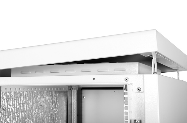 Шкаф комплектуется новыми юнитовыми направляющими на всю высоту шкафа – деление шкафа на отсеки возможно при помощи дополнительной полки. Таким образом, обозначение модифицированного шкафа теперь соответствует максимальной полезной высоте в юнитах (например, в шкаф ШТВ-1-24.7.9-43АА установлены юнитовые направляющие 24U на всю высоту шкафа). Новая конструкция направляющих более жёсткая и имеет ZERO-U-крепление на боковой поверхности, что расширяет монтажные возможности шкафа. Крыша шкафа теперь съёмная – при открытой двери достаточно выкрутить два винта и потянуть крышу на себя. Для перемещения либо подъёма шкафа на высоту была переработана система зацепов – теперь транспортировочные уши выполнены из стали 3 мм и находятся в скрытом положении под съёмной крышей, теперь потребителю не нужно вывинчивать их из боковых стенок и глушить болтами монтажные отверстия. В качестве аксессуара доступна модификация крыши с выдвижным козырьком для защиты от осадков во время работы с оборудованием. После установки крыши на место возможна её дополнительная усиленная фиксация шестью винтами к каркасу шкафа.
